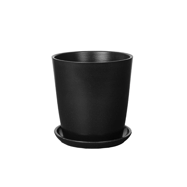 Горшок с поддоном в черном цвете выполнен из керамики. Он подходит для выращивания большинства растений. В него можно посадить декоративно-лиственные, красивоцветущие или ампельные растения, суккуленты или кактусы. Цвет горшка насыщенный черный, в нем эффектно будут смотреться растения с яркими зелеными листьями. Благодаря универсальному цвету можно выигрышно расположить горшок с растением в любом интерьере. В светлом дизайне помещения он контрастно выделится и будет притягивать внимание, а в темном добавит оттенок в монохромное сочетание.