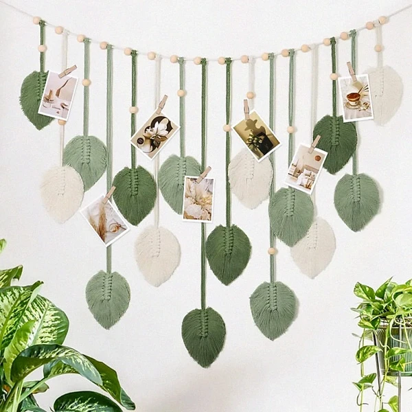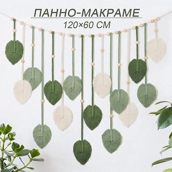 Оригинальное настенное панно, выполненное из листьев в технике макраме. Это уникальное изделие может стать не только эффектным элементом декора, но и практичным аксессуаром для вашего интерьера и служить основой для крепления ваших любимых фотографий. Удобные завязки позволяют легко разместить снимки, добавляя индивидуальности вашему пространству. Панно выполнено в натуральных оттенках, что позволяет ему гармонично вписаться в любое пространство, будь то гостиная, спальня или прихожая. Этот декор станет прекрасным подарком для любителей уютных интерьеров и растений.