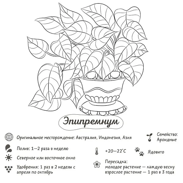 В раскраске 30 иллюстрации самых известных интерьерных растений, а также любопытные факты о них с таблицами для самопроверки. Отвлекитесь от ежедневных хлопот и узнайте, как необходимо заботиться о своих комнатных зелёных обитателях. Это очень увлекательно и полезно!