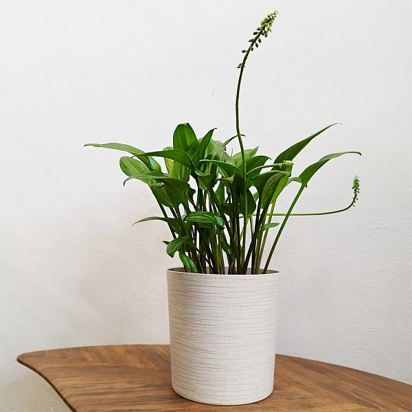 Луковичное растение с овально-заострёнными листьями, покрытыми тёмными пятнами на светлом фоне, цветёт мелкими белыми или кремовыми колосовидными соцветиями с лёгким сладковатым ароматом. Дримиопсис сохраняет декоративность круглый год, но зимой может частично сбрасывать листья, легко размножается луковицами-детками. Растение нуждается в ярком рассеянном свете, при котором пятнистый узор проявляется лучше, и умеренном поливе. Дримиопсис пятнистый привлекательно смотрится в любом интерьере, к тому же, очищает воздух от токсинов.