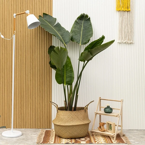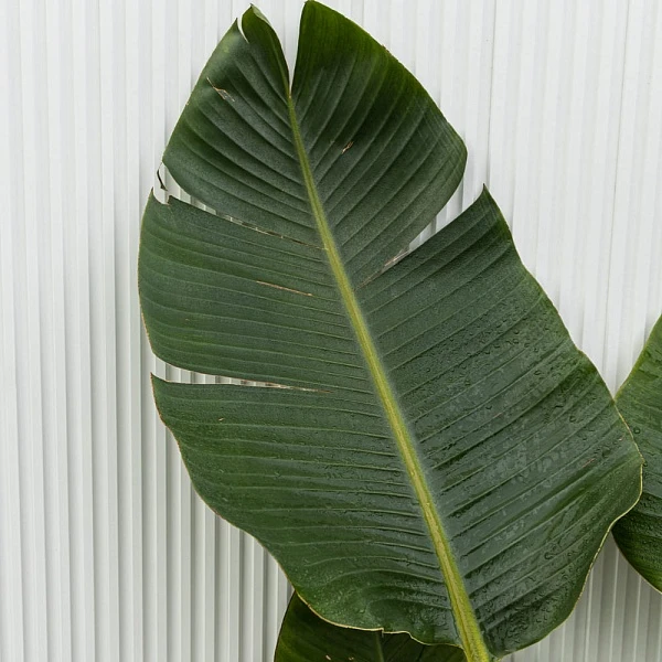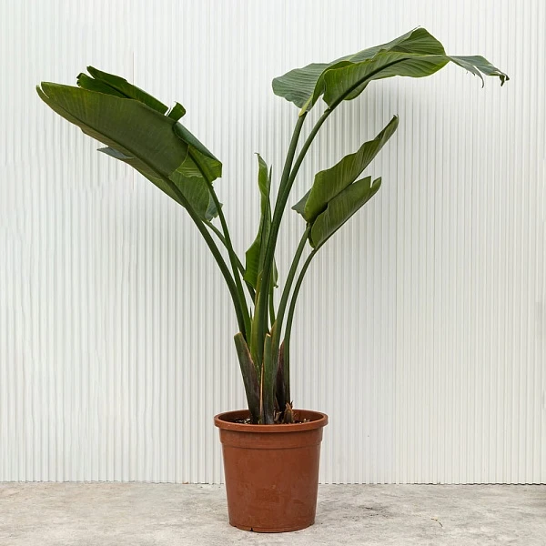 Высокое, величественное растение с большими тёмно-зелёными листьями овальной формы с характерными разрезами. Цветёт крупными цветами с белыми и синими лепестками, напоминает голову райской птицы. Нуждается в ярком рассеянном освещении, умеренном поливе, немного повышенной влажности. Подойдёт для выращивания как в большом жилом или офисном помещении, так и в оранжерее, зимнем саду.
