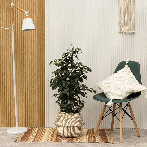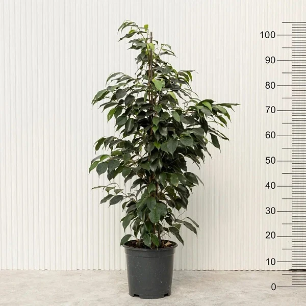 Популярный декоративный кустарник органично вписывается в домашнюю обстановку и офисное пространство. У этого Фикуса пирамидальная крона из небольших ярко-зеленых листьев овальной формы. Они плотно расположены на ветвях, создавая эффектную зеленую массу. Растение легко адаптируется к полутени и к рассеянному освещению без прямых солнечных лучей, чувствительно к резким изменениям температуры. Нуждается в регулярном поливе, но без переувлажнения.