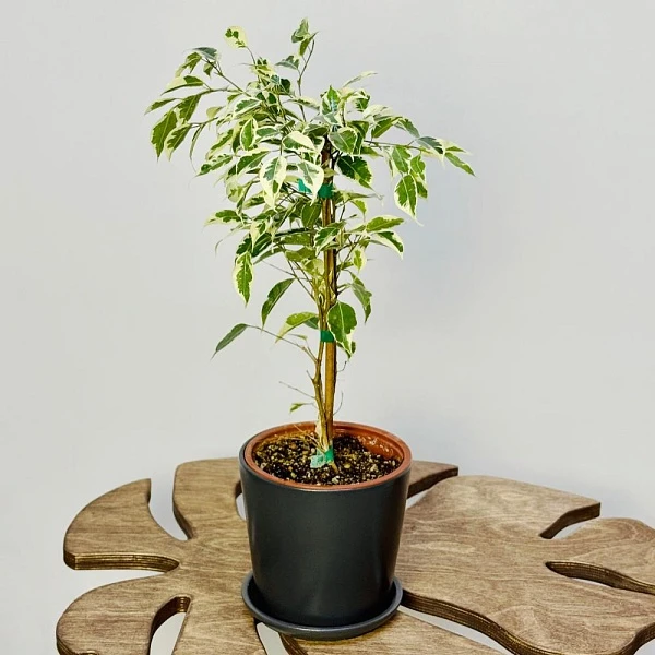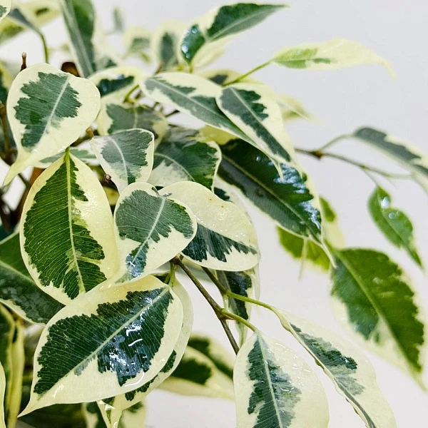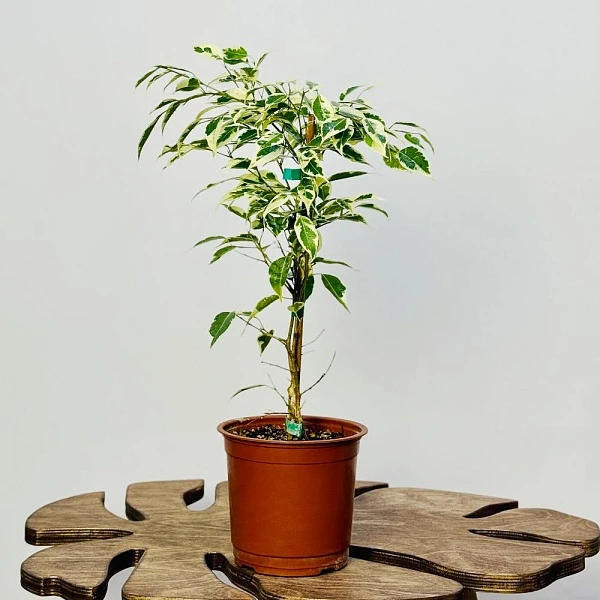 Фикус Бенджамина сорта «Старлайт» — это настоящее украшение для дома, привлекающее внимание своей необычной пестролистной листвой. Его название в переводе с английского «звёздный свет», намекает на его особенную красоту. Этот фикус развивается постепенно, а его ствол имеет приятный светло-бежевый цвет, который с возрастом растения становится всё более светлым.