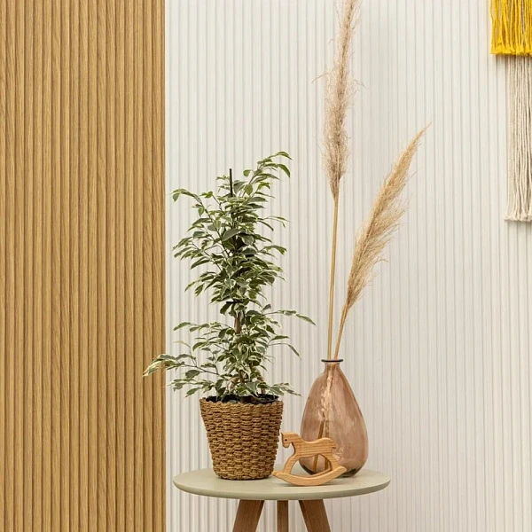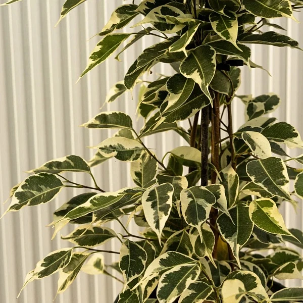 Декоративное комнатное растение отличается своей привлекательной, красиво разветвленной кроной. Листья этого фикуса мелкие, овальной формы, с ярко-зеленым цветом и красивыми белыми или кремовыми пятнами. Фикус Старлайт хорошо растёт при ярком, но рассеянном свете. Он чувствителен к резким изменениям температуры и предпочитает умеренный полив, позволяя верхнему слою почвы подсыхать. Это неприхотливое растение станет выразительным элементом в любом интерьере.