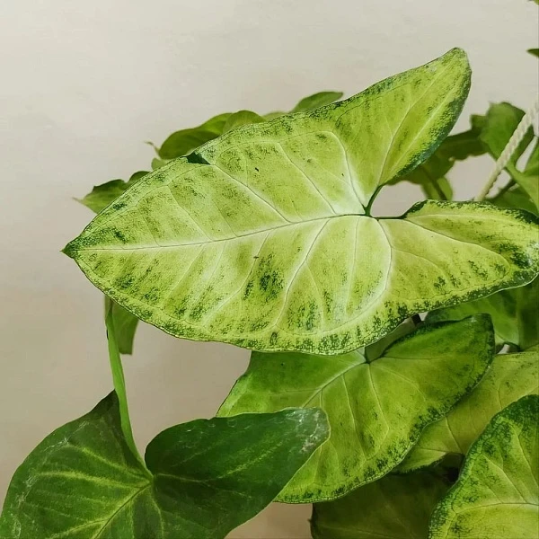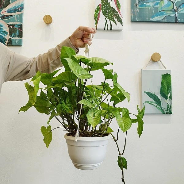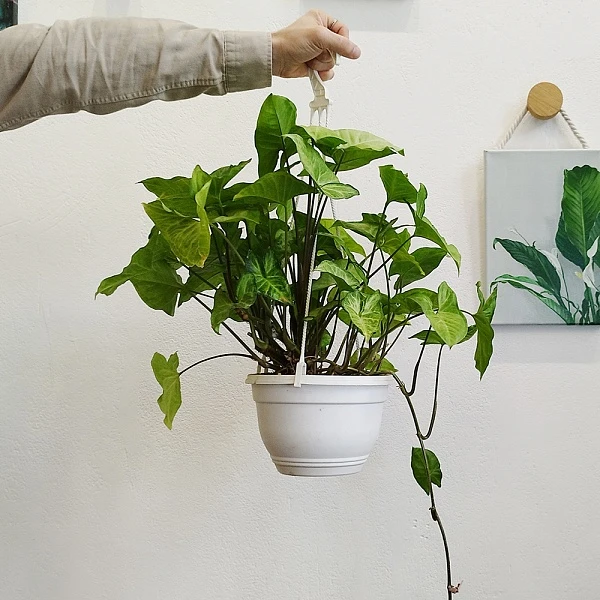 Это быстрорастущая ампельная лиана с воздушными побегами и сердцевидными листьями. Её молодая листва ярко-зелёного цвета с небольшой акварельной пестротой. Сингониум очищает воздух от формальдегида и других токсинов, легко размножается черенками. Растение предпочитает умеренный полив и любит опрыскивания. Идеально смотрится в подвесных кашпо, когда побеги элегантно ниспадают вниз.
