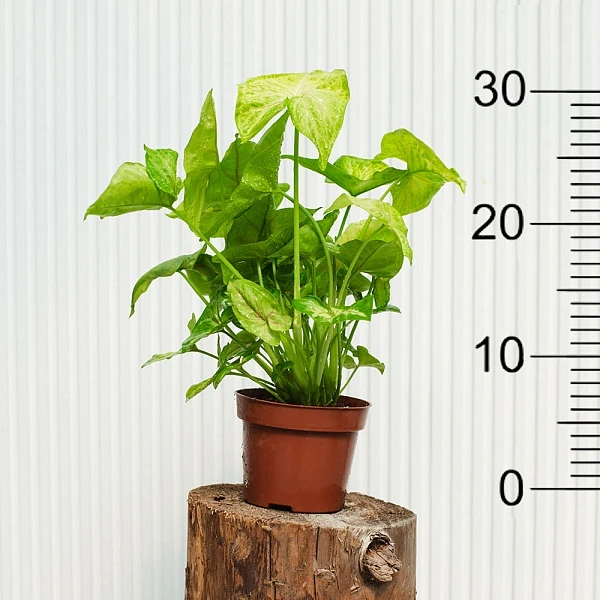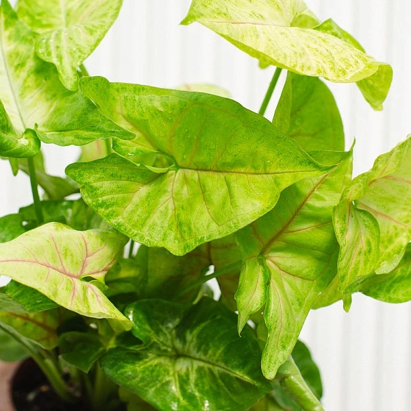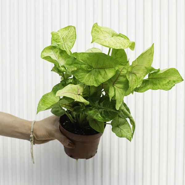 Абсолютно неприхотливая лиана с копьевидными, рельефными, пёстрыми листьями с преобладанием кремово-жёлтого, салатового и нежно-зелёного цветов с ярко-выраженными розовыми жилками. Предпочитает яркое рассеянное освещение, регулярный полив и повышенную влажность воздуха. Станет украшением любого интерьера. Можно выращивать на опоре, в подвесном кашпо или формировать обрезкой кустик.