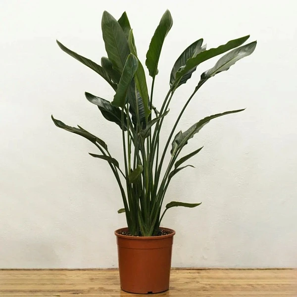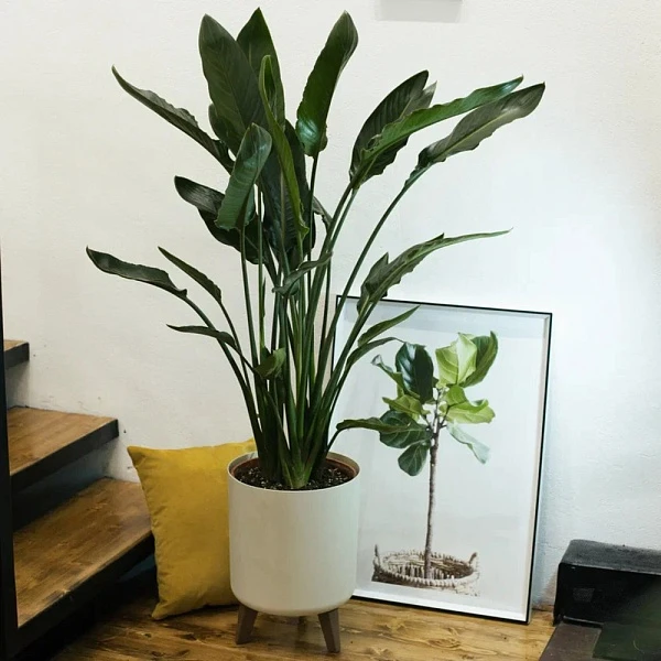 Стрелиция Регина - одно из самых красивых и эффектных тропических растений, которое также называют райской птицей или королевским растением. Она привлекает внимание своими большими листьями и цветами, напоминающими длинный клюв птицы с красивым оранжевым хохолком. Стрелиция, без преувеличения, станет главным украшением интерьера и добавит в пространство яркий зеленый акцент и нотки тропиков. Растение предпочитает яркий рассеянный свет, обильный полив с весны до осени по мере просыхания верхнего слоя грунта и умеренный зимой. Рекомендуется соседство с увлажнителем воздуха.