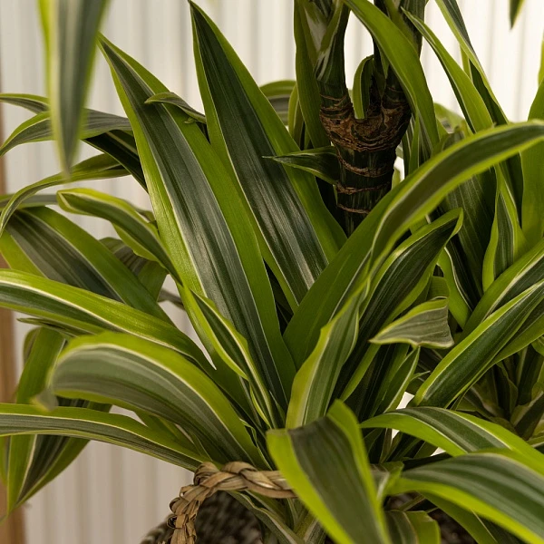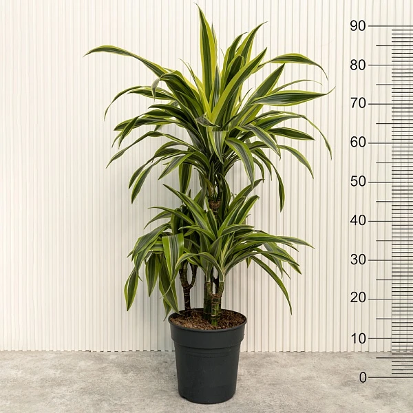 Самый популярный сорт среди драцен с яркими листьями. Отличается сочной расцветкой листьев с зелеными, матово-белыми и желто-золотистые полосами. Достаточно неприхотлива, но для сохранения интенсивности окраски требуется яркий рассеянный свет. Это лучший выбор для помещений, где нужно добавить яркости и сочности интерьеру, подойдет как для домашнего, так и для коммерческого озеленения.