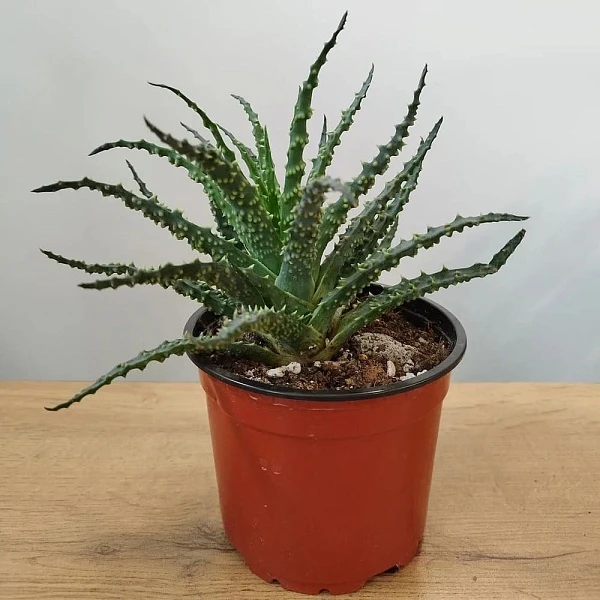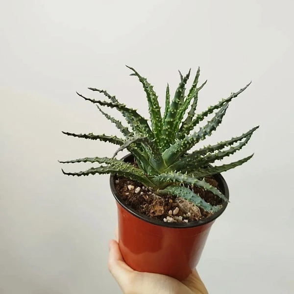 Суккулент с плотными серо-зелёными листьями, покрытыми шипами, обладает стойким характером. Растение выдерживает засуху и перепады температур, отлично чувствует себя при максимально ярком свете с прямыми солнечными лучами. А ещё ему требуется редкий полив, когда полностью просохнет песчано-каменистый грунт. Алоэ Мара выглядит очень стильно и будет хорошо смотреться на книжных полках или рабочем столе.
