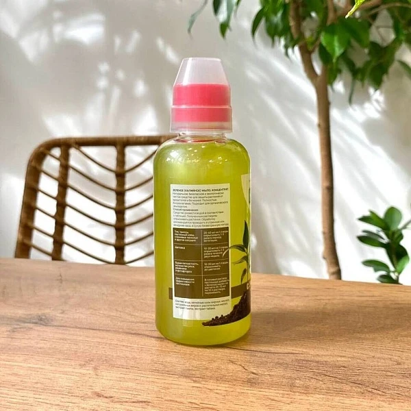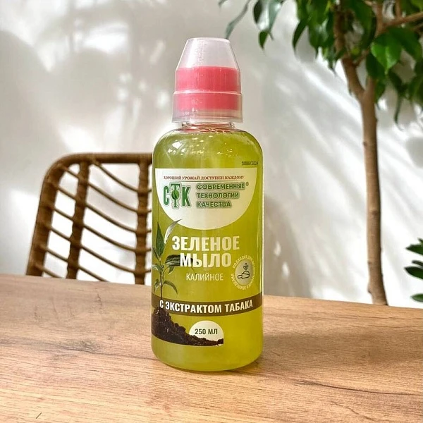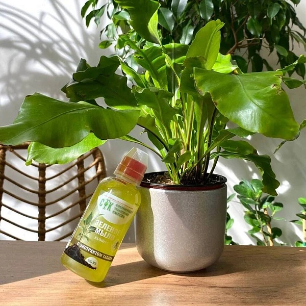 Средство укрепит здоровье декоративных и комнатных растений и защитит их от вредителей. Зелёное мыло убережёт зелень от ржавчины, пятнистости и мучнистой росы. Экстракт табака усилит эффект, оградив от инфекций и насекомых. Это 100% натуральный продукт, безопасный и полностью биоразлагаемый. В разведённом водой виде средством рекомендуется опрыскивать растения в утренние или вечерние часы. В комплекте с мылом идёт мерный стаканчик.